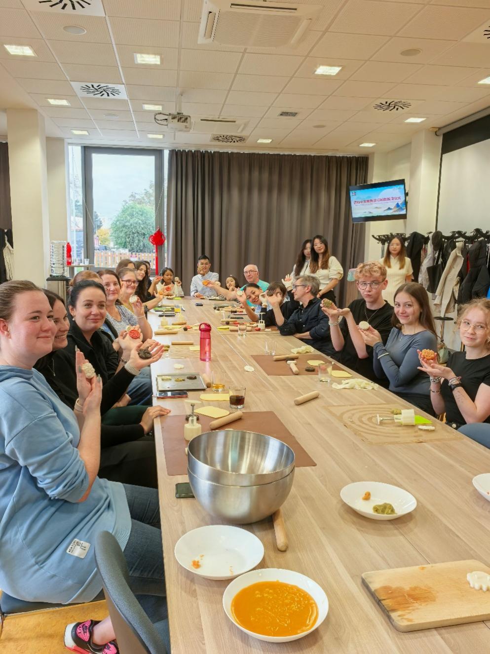 工坊里,孔堂与同学们准备了多样口味的月饼皮和馅料,供大家自由搭配。制作步骤看似简单:将月饼面团揉成均等圆球,压扁裹馅,再用模具压制。可初次接触的学员们难免手忙脚乱。这时,9位来自中国的“小助教”便化身文化使者,手把手教学,耐心解释制作原理。当一个个印有“中秋”“团圆”字样,刻着嫦娥、月亮、兔子图案的精巧月饼从模具中诞生,学员们的惊喜溢于言表。大家一边教做月饼,一边讲解图样寓意,让文化传播在工坊的热火朝天里“润物细无声”,让中国文化的团圆意蕴悄悄走进捷克友人的心间。