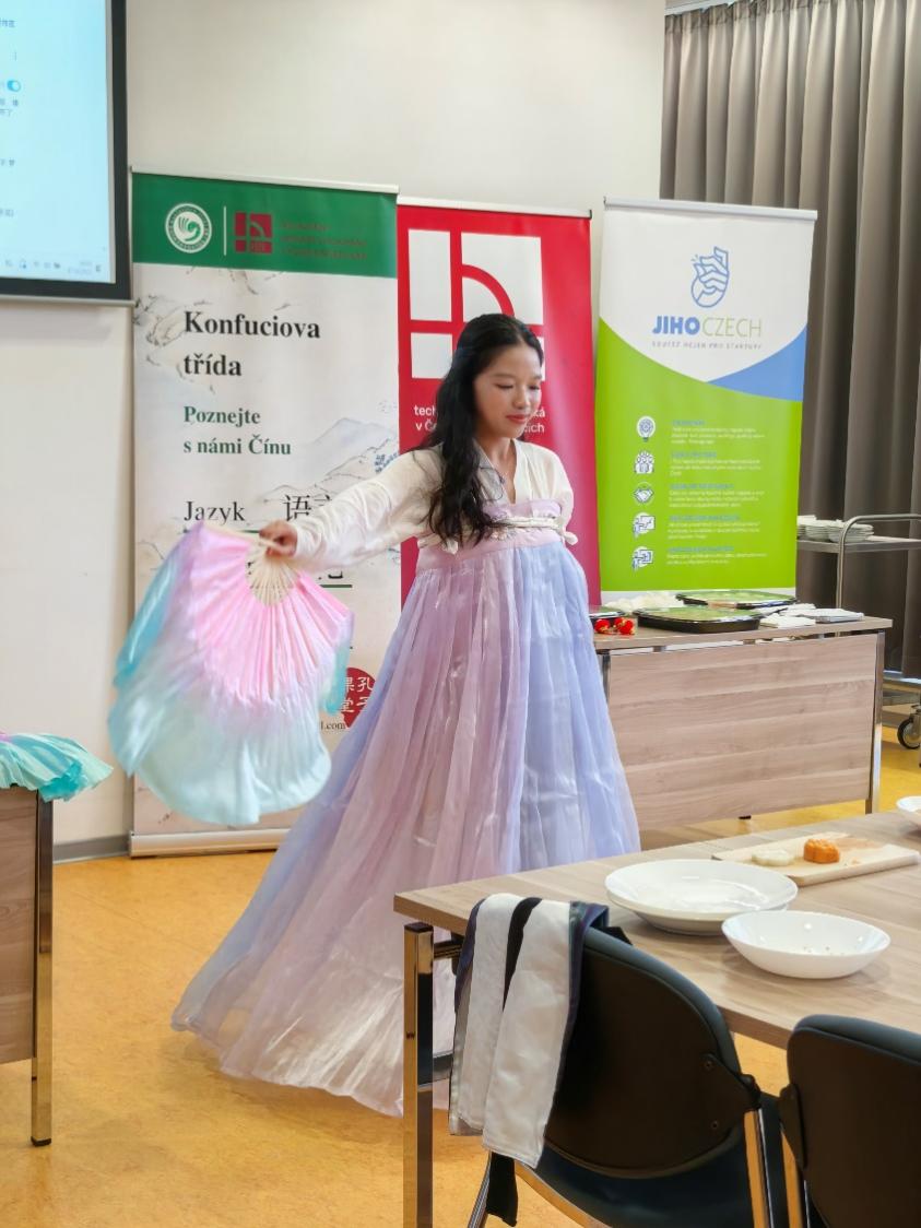 当学员们换上形制典雅的汉服,交领右衽、宽袍广袖间是华夏服饰文化的千年积淀;当大家身着剪裁得体的旗袍,盘扣摇曳、裙摆生姿中是东方女性的婉约与端庄。同学们从汉服的“礼仪符号”讲起,解析服饰里的文化密码;在旗袍的试穿体验中,让捷克友人直观感受“东方美学”的韵味与气度。这不仅是一场服饰的体验,更是一次以传统服装为媒的文化对话——大家将母校“诚信、宽容、博学、务实”的精神融在文化传播的细节里,借由汉服的一针一线、旗袍的一襟一摆,向世界传递中国文化的雅致与母校的育人温度。