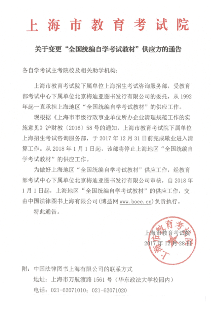 关于变更“全国统编自学考试教材”供应方的通告