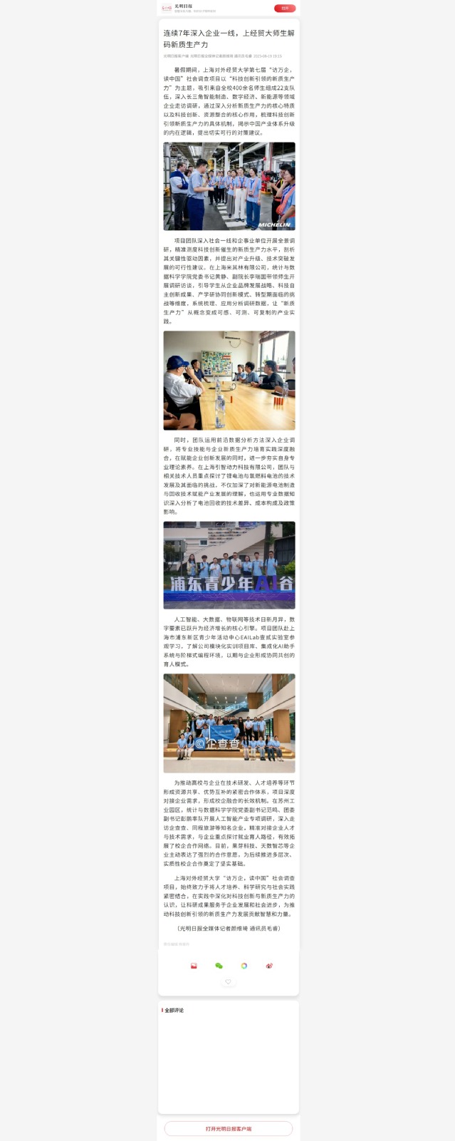 项目团队深入社会一线和企事业单位开展全景调研,精准测度科技创新催生的新质生产力水平,剖析其关键性驱动因素,并提出对产业升级、技术突破发展的可行性建议。在上海米其林有限公司,统计与数据科学学院党委书记黄静、副院长李瑞囡带领师生开展调研访谈,引导学生从企业品牌发展战略、科技自主创新成果、产学研协同创新模式、转型期面临的挑战等维度,系统梳理、应用分析调研数据,让“新质生产力”从概念变成可感、可测、可复制的产业实践。