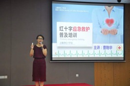 培训会最后针对进博会期间志愿者们可能遇见的危急情况进行了红十字急救护培训。主讲老师具体介绍了身体的各个部位发生的常见问题及解决方案,并且手把手指导上台体验的志愿者,使志愿者们受益匪浅。