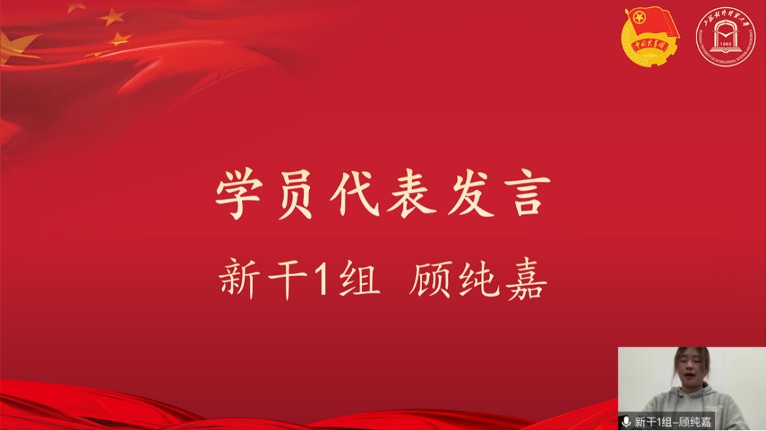 在一个月的学习中,学员们于尝试与挑战中不断突破,于自省和总结中不断提升。新干1组学员、国商2102团支部团支书顾纯嘉同学作为学员代表,分享了她通过新干班这个平台学习到的宝贵经验。她表示,在与诸多同级团干部产生思维碰撞的同时,对党团也有了更加深刻的认识。最后,她用“奋斗”一词概括了新干班给她带来的感受,并希望未来能同其他团支书一起探索并实践团支部成长之道,带领团支部青年共同为实现中华民族伟大复兴的中国梦而努力奋斗。