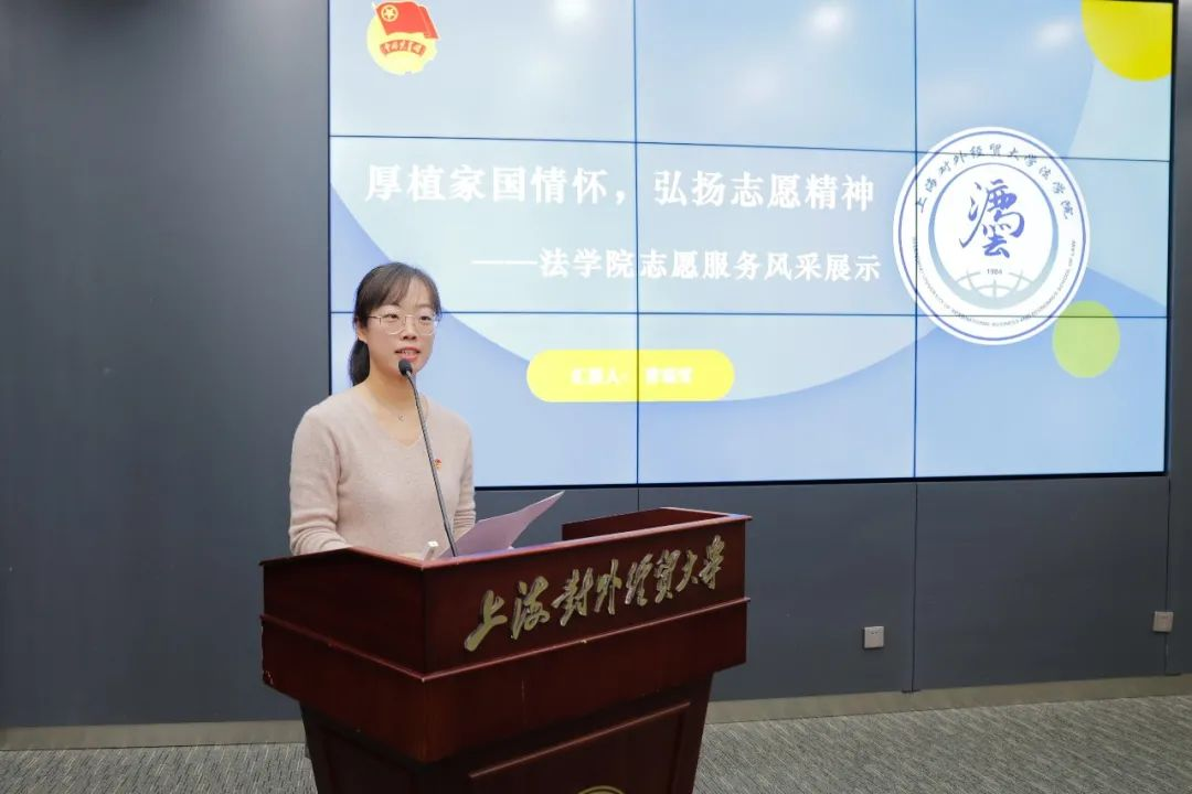 先进集体代表、法学院团委书记曹瑞雪向大家简要介绍过去一年学院的志愿服务特色,通过多项志愿服务积极为群众办实事,依托专业优势在“3.15”等重要时点开展普法宣传,积极引导学生前往西部、应征入伍,在祖国需要的地方建功立业。