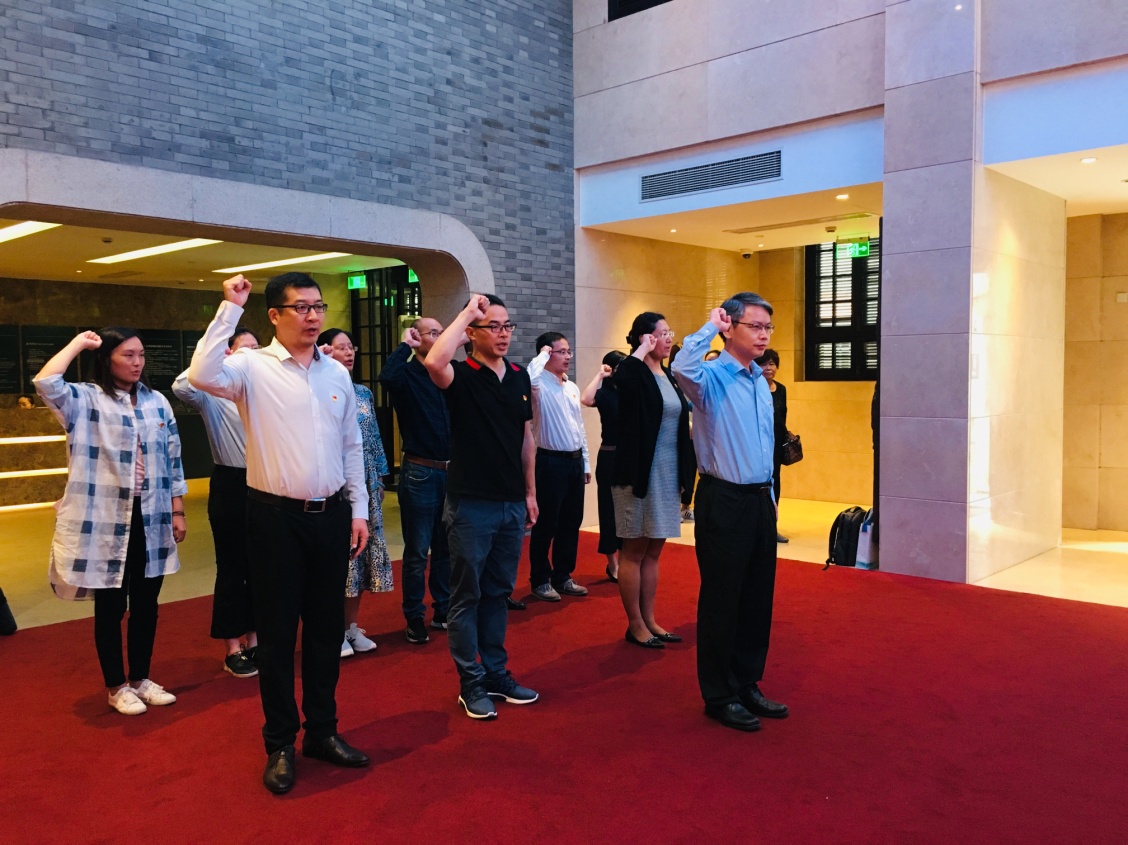 序厅展馆内庄严肃穆,在祁明带领下,全体党员同志面向党旗,庄严宣誓。