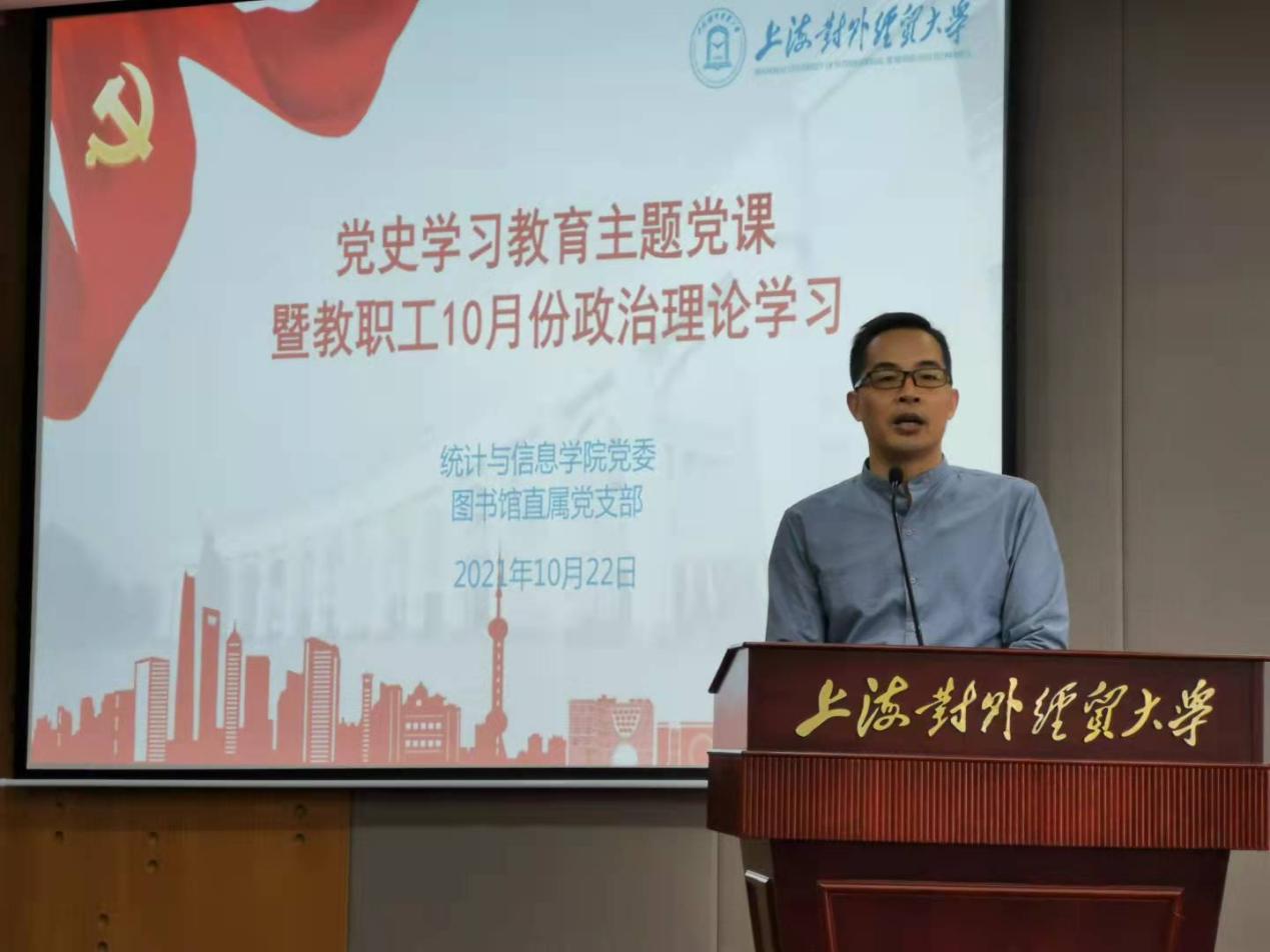 为进一步深入学习领会习近平总书记“七一”重要讲话精神,从党的百年伟大奋斗历程中汲取智慧和力量,10月22日下午,学院邀请中共上海市委党校中共党史研究部王瑶副教授作“上海红色文化与伟大建党精神——深入学习习近平总书记“七一”重要讲话精神”专题辅导报告。学院领导班子成员,全体教职工、全体学生党员以及学校图书馆直属党支部党员参加了学习会。会议由学院党委书记范登峰主持。