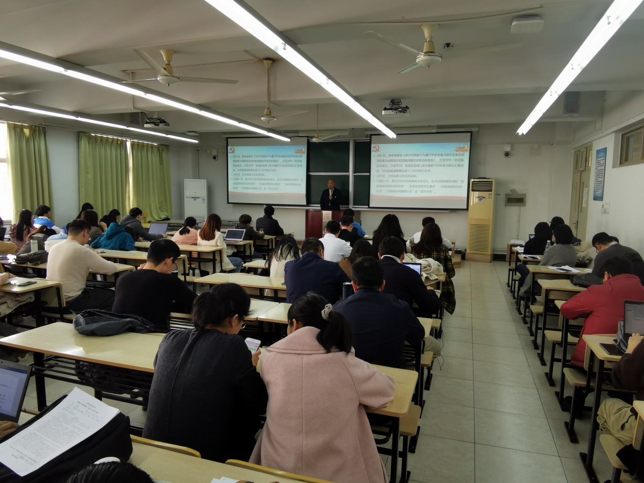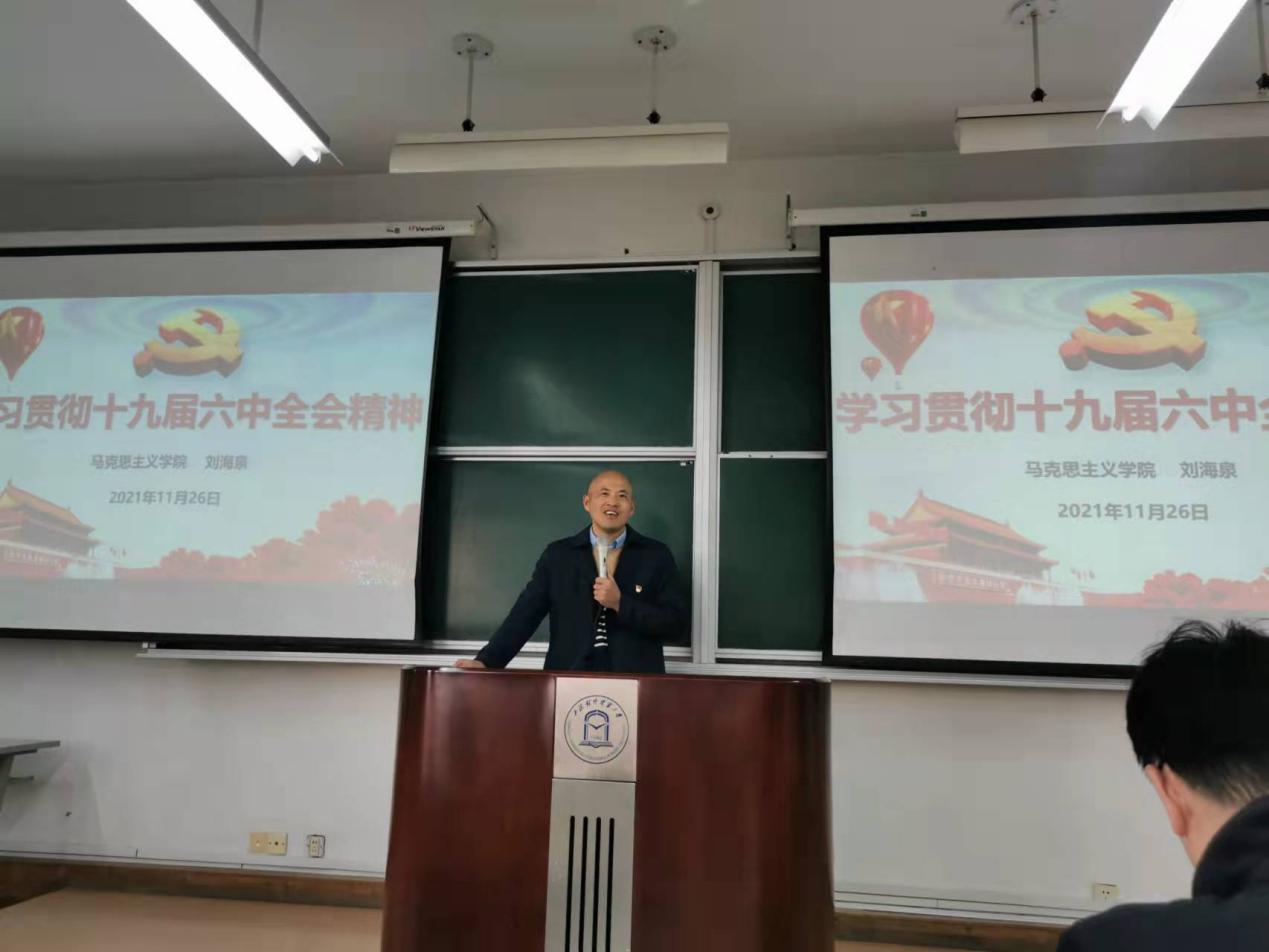 刘海泉副教授介绍了党的十九届六中全会召开的总体情况,并结合自身的学习体会着重阐述了《中共中央关于党的百年奋斗重大成就和历史经验的决议》(简称《决议》)的主要内容和重大意义。他引经据典、旁征博引,从历史和现实的维度对党的十九届六中全会精神进行了深刻解读,帮助学院师生深刻领会《决议》的重要论断,学懂弄通党的十九届六中全会精神。大家纷纷表示报告深入浅出,对自己学习和领悟党的十九届六中全会精神受益良多。