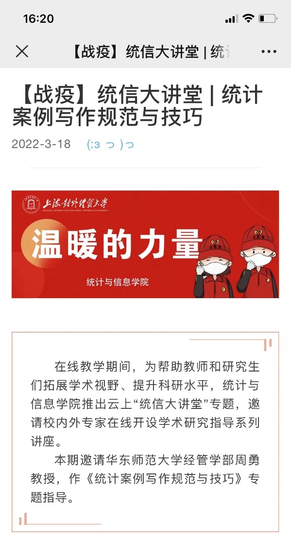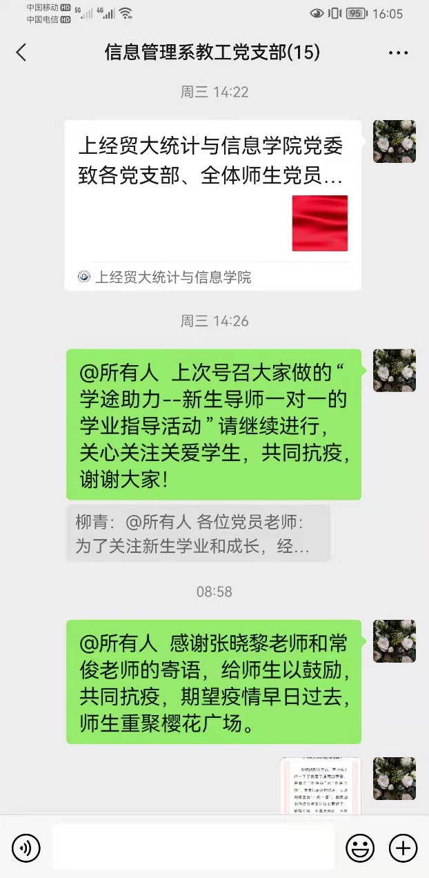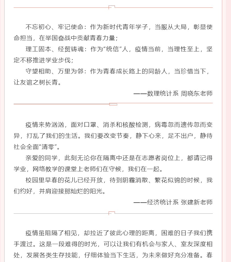 “一课一策”,全力保障在线教学。为确保在线教学期间人才培养“不断线、不降质”,学院党委加强线上教育教学质量监控,成立在线教学质量工作保障组,结合课程要求和学生在线学习实际情况,做好在线教学和学业指导方案。学院全体教师严格按照在线教学要求,以饱满的热情、认真的态度投入到教学中。教师支部组织教师交流研讨在线教学工作,不断改进教学方法,不断加强师生互动,让学生云端学习有收获、有温度。分类指导,开展“云上课程帮”“云上统信大讲堂”。针对学生在线学习过程中的实际需要,教师党支部开展“云上课程帮”活动,应用数学系教工党支部康悦明、张澍轶、李瑞囡、刘海、刘忠莉、周大鹏等6位教师主动组团开设高等数学等课程指导系列讲座,助力学生高效在线学习;开展“云上统信大讲堂”,各系教师陆续邀请校内外专家开设学术科研讲座,帮助学生提升在线教学期间的学术科研水平。结对帮扶,教师暖心办实事。师生党支部建立导师结对机制,教师们主动关心学生的学业发展、居家生活、心理状况等。信息管理系、经济统计系、数据科学系教工党支部纷纷明确要求,号召教师们“一对一”全覆盖通过电话、微信等方式与学生进行沟通交流。数理统计系教工党支部书记赵霞老师提醒支部每一位老师,要特别关心学业困难和就业困难的学生,给予专项帮助。为鼓励同学们坚定信心、共渡难关,学院教师们主动通过微信公众号向同学们寄语,优秀党务工作者张建新、“师德标兵”周晓东等近20位老师对同学们谆谆提醒、深深关切,温暖人心的话语,给同学们注入了强大的勇气和力量。