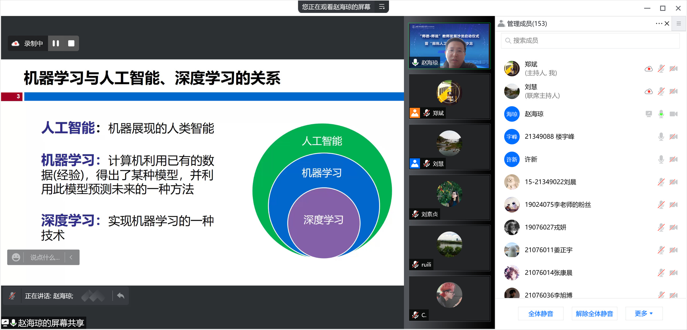 启动仪式后,举行了首期专题沙龙。围绕人工智能本科新专业建设以及人工智能与统计交叉学科建设,沙龙以“拥抱人工智能”为主题,师生分享和探讨了人工智能研究领域的最新成果。沙龙由统计与信息学院副院长刘慧主持。