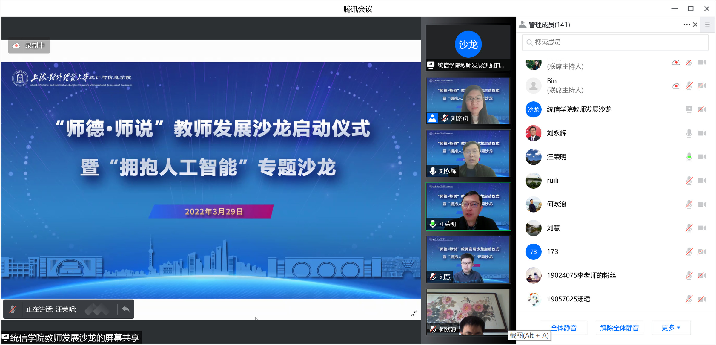 为进一步加强学院新时代师德师风建设,构建教师发展共同体,3月29日下午,统计与信息学院“师德·师说”教师发展沙龙启动仪式暨首场专题沙龙在线举行,校长汪荣明出席并讲话。校科研处处长何欢浪,统计与信息学院领导班子、学院师生150余人参加活动,活动由统计与信息学院院长刘永辉主持。
