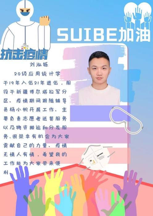 刘泓铄就读于20级应用统计学专业,19年入伍21年退伍,服役于新疆博尔塔拉军分区。他于三月十一日报名志愿者,同辅导员杨小帆开展志愿服务。他的主要工作是担任疫情期间的志愿者送餐服务及统计与信息学院的物资搬运和分发服务。