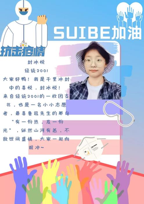 封冰悦是经济统计学1班的团支书,她参与了社区清洁、滚动核酸晚餐志愿者等多个志愿活动。她最喜欢的鲁迅先生那句“一份热,发一份光”,她坚信,纵然山河有恙,不敌世间盛情,同学们定能一起共度这次难关。