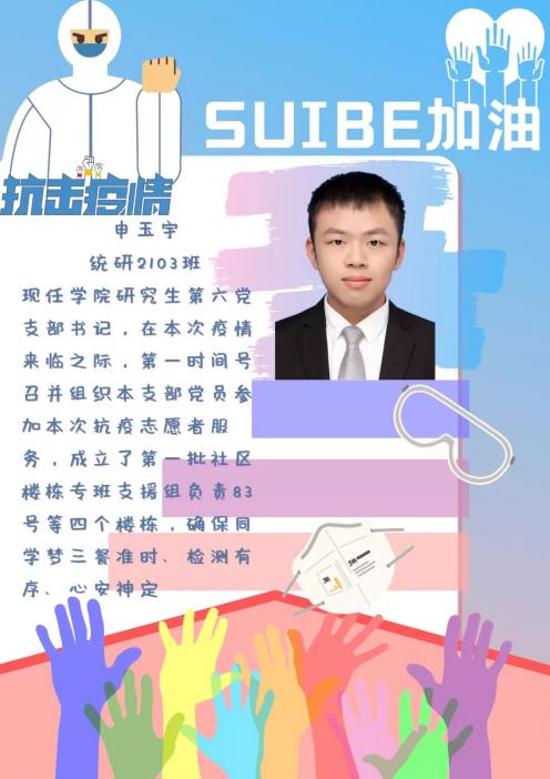 申玉宇来自统研2103班,现任必赢626net入口首页统计与信息学院的研究生第六党支部书记。面对这次突然的疫情,他第一时间召开并组织该支部党员参加此次的抗疫志愿者服务,成立了第一批社区楼栋专班志愿组,负责83号等四个楼栋,负责同学们三餐和检测的秩序协调工作,让同学们被疫情影响的心神能够平定下来。