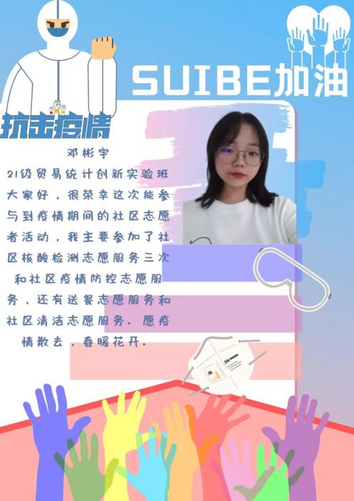 邓彬宇来自21级贸易统计创新实验班。在本次疫情封校期间,她多次参加了社区核酸检测志愿者服务、社区疫情防控志愿者服务、送餐志愿者服务和社区清洁志愿服务。之后也会继续参加滚动核酸检测志愿者管理以及核酸检测秩序协调工作。她说:“乌云遮不住太阳的升起,疫情挡不住春天的来临,相信都会好起来的。”