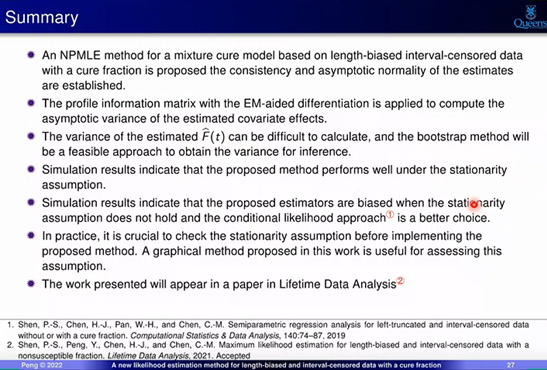 彭英伟教授主要从激励范式和符号、没有协变量的模型、有协变量的模型、模拟研究及总结性陈述等五个部分进行了报告。彭教授介绍了MotivatingExample andNotations,即本研究基于台湾地区对有早发性糖尿病风险的个体数据进行三次随访,考虑队列研究数据进行早发性糖尿病风险的分析,其中Age作为时间变量,并对相应符号及各部分的假设做了详细陈述。彭教授深入阐释了TheModel without Covariates、SimulationStudies及Application部分的内容。最后,他还向师生们推荐了CureModels等相关书籍,希望对此研究领域感兴趣的师生,可以通过这些书籍进行系统学习。