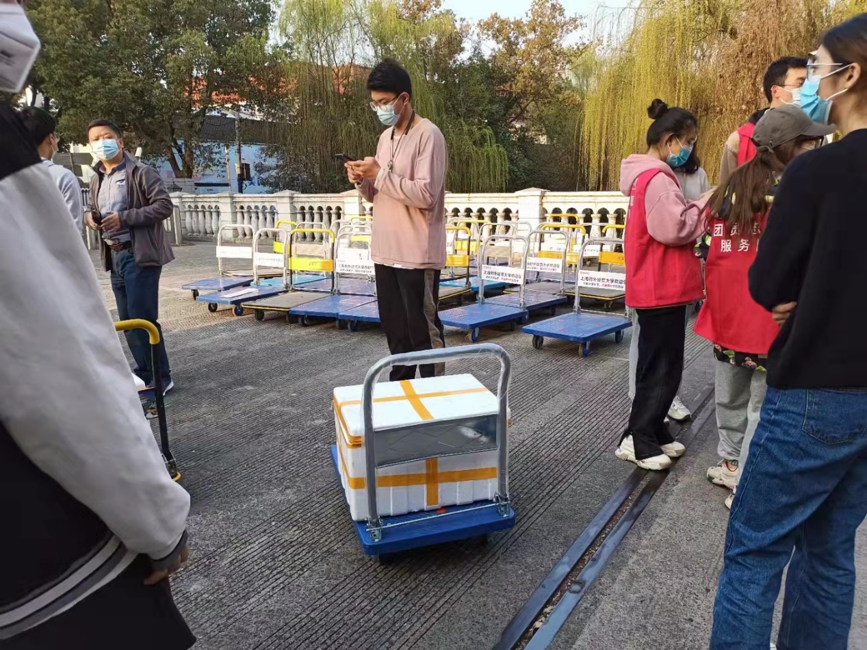 小推车在送餐志愿者的工作发挥着重要作用。“清晨,寒潮带来的寒风,吹散之前逐渐变热的空气,走出宿舍楼,仍然可以听见运送的四轮车在地面上发出咕噜咕噜的声响,送餐的志愿者们带着口罩,快步走着。(《春江水暖,倾情奉献》)”在这比昔日略显冷清的社区中,小推车的声音是不可忽视的。每当“咕噜咕噜”的声音响起时,就有一批志愿者在热情工作,同学们就能吃上热腾腾的饭餐。小小的推车承载起精心包好的可口饭菜,也是疫情封闭中别样的温暖。