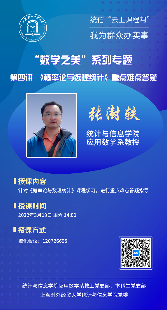 3月16日晚19:00起,统计与信息学院党委组织师生党支部开展“云上课程帮”活动,由应用数学系教工党支部教师开设高等数学云上指导系列课程,在腾讯会议开讲。疫情当前,本次活动共有李瑞囡、康悦明、周大鹏、张澍轶、刘海与刘忠莉六名教师参与,设有六个主题,旨在带领同学们领略数学之美,助力同学们高效在线学习。