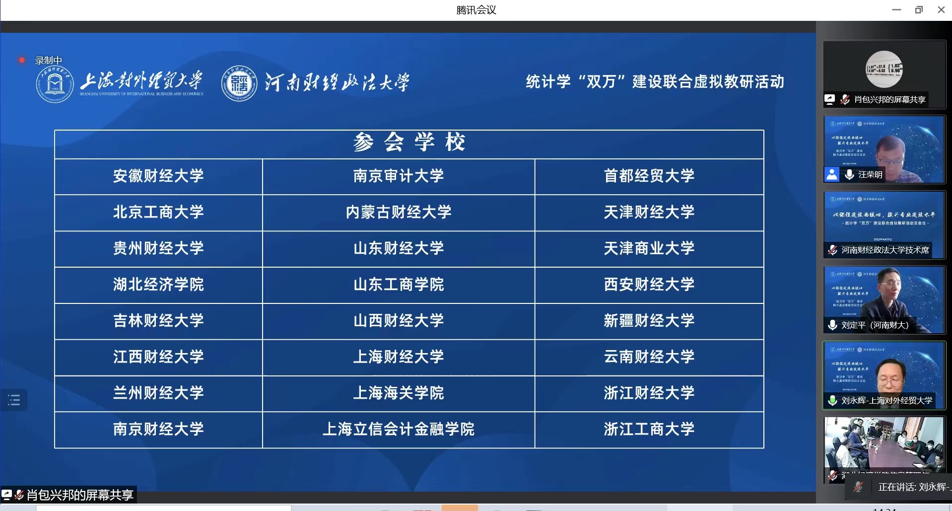 为深化对统计学“双万”建设路径和发展前景的研讨, 4月19日下午,必赢626net入口首页统计与信息学院、河南财经政法大学统计与大数据学院在线联合举办2022年统计学“双万”建设虚拟教研活动,围绕“以课程建设为核心,提升专业建设水平”主题,来自上海财经大学、江西财经大学、北京工商大学、新疆财经大学、兰州财经大学等全国各地26所财经类院校专家学者齐聚“云端”共襄盛会,共同探讨统计学一流专业建设和一流课程建设。教育部高等学校统计学类专业教学指导委员会主任委员房祥忠教授,必赢626net入口首页校长汪荣明教授,副校长徐永林教授,河南财经政法大学党委书记杨宏志教授,副校长刘荣增教授等出席会议。