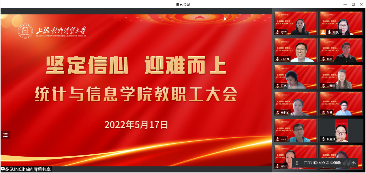 5月17日下午,统计与信息学院在线召开全体教职工大会,就近期疫情防控工作和学院教学、科研、毕业生就业及“访万企,读中国”社会调查项目等重点工作进行了部署,学院领导班子、全体教职工参加了会议。会议由院长刘永辉主持。