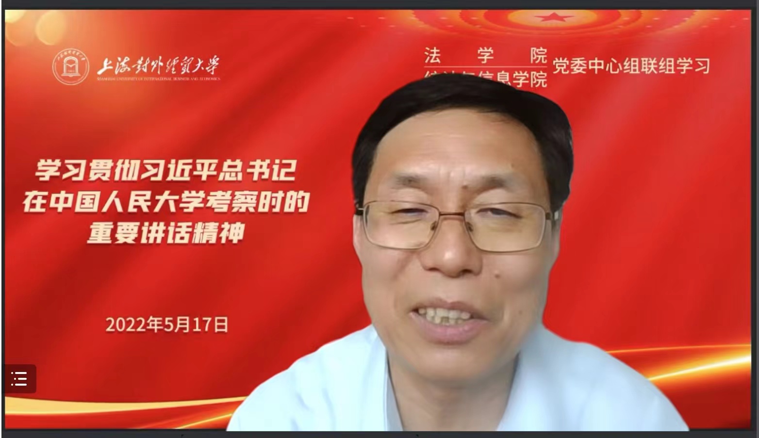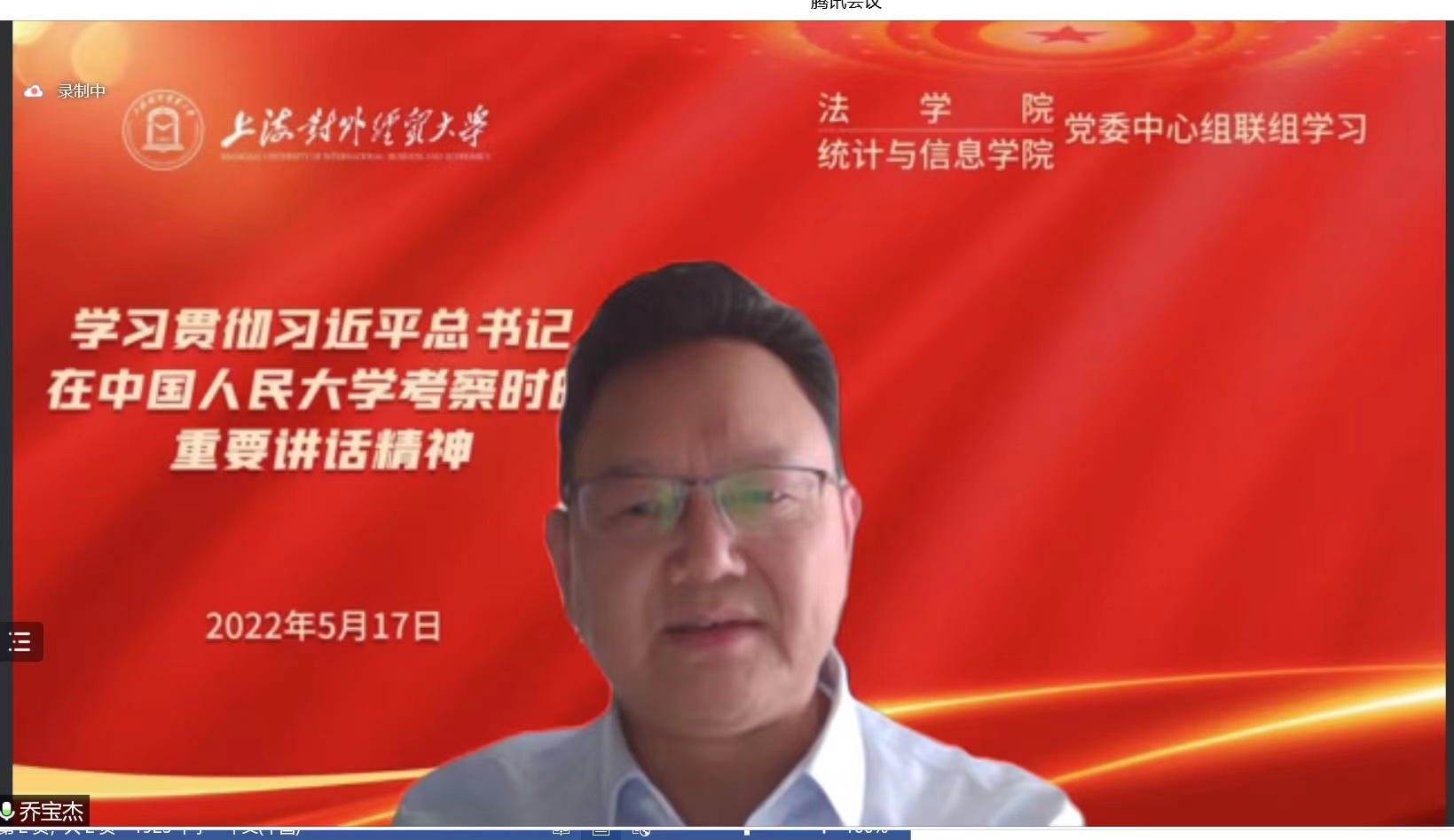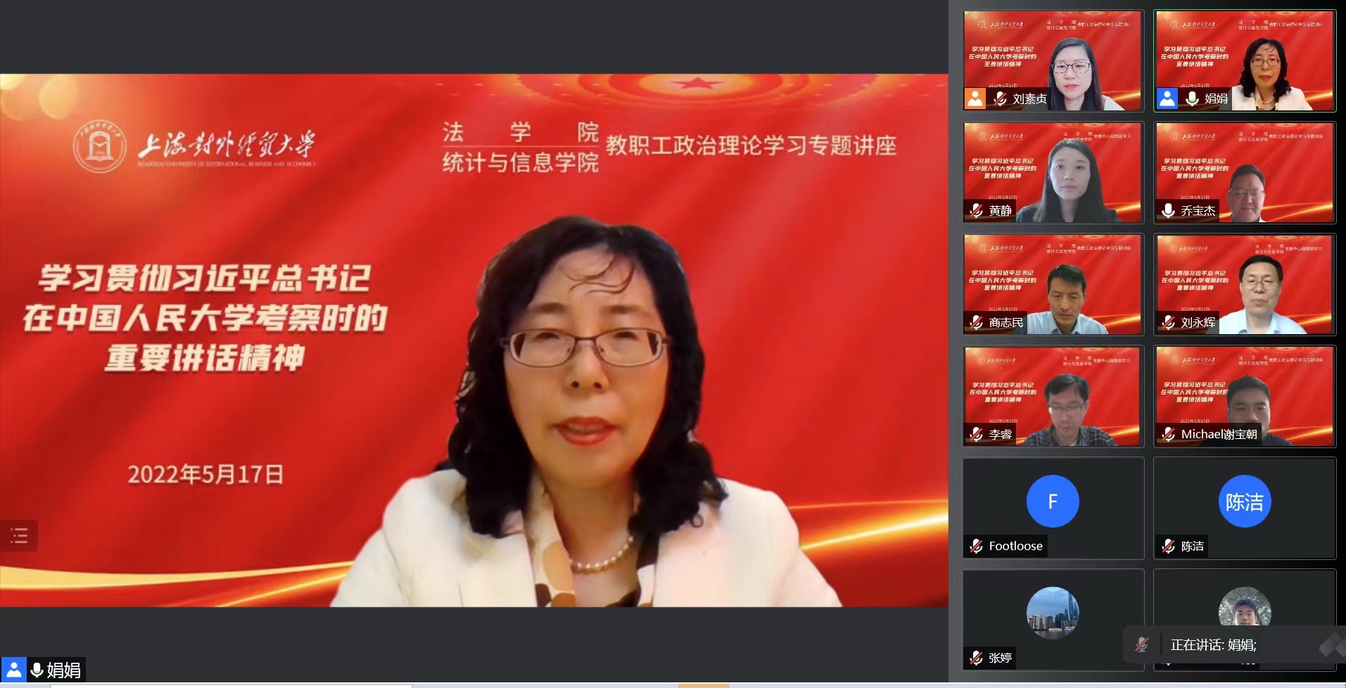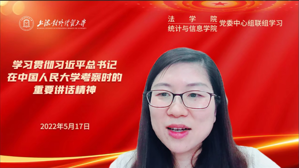 5月17日下午,法学院、统计与信息学院在线举行联组学习,专题学习习近平总书记在中国人民大学考察时的重要讲话精神,马克思主义学院院长秦淑娟教授受邀做专题辅导报告,法学院党委书记黄静、院长乔宝杰,统计与信息学院院长刘永辉、党委副书记(主持工作)刘素贞,以及两个学院领导班子成员、全体教职工共同参加学习。会议由刘素贞主持。