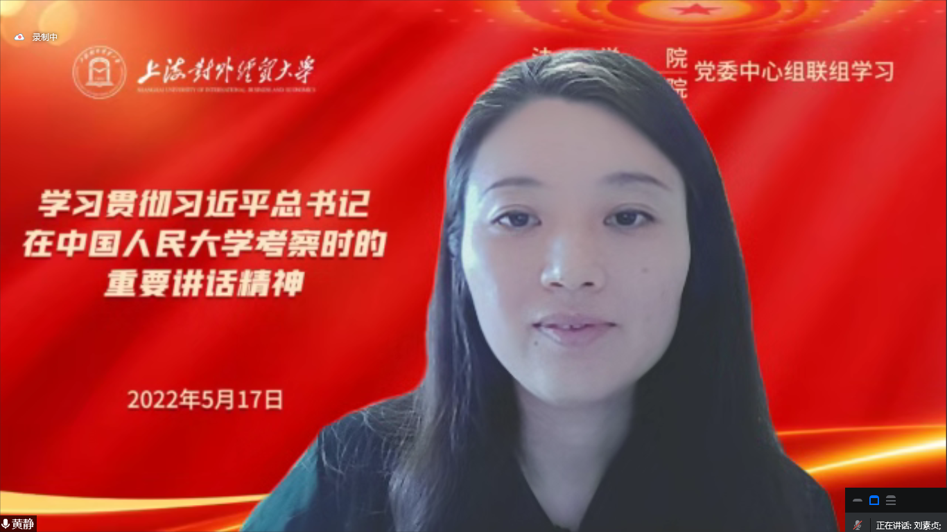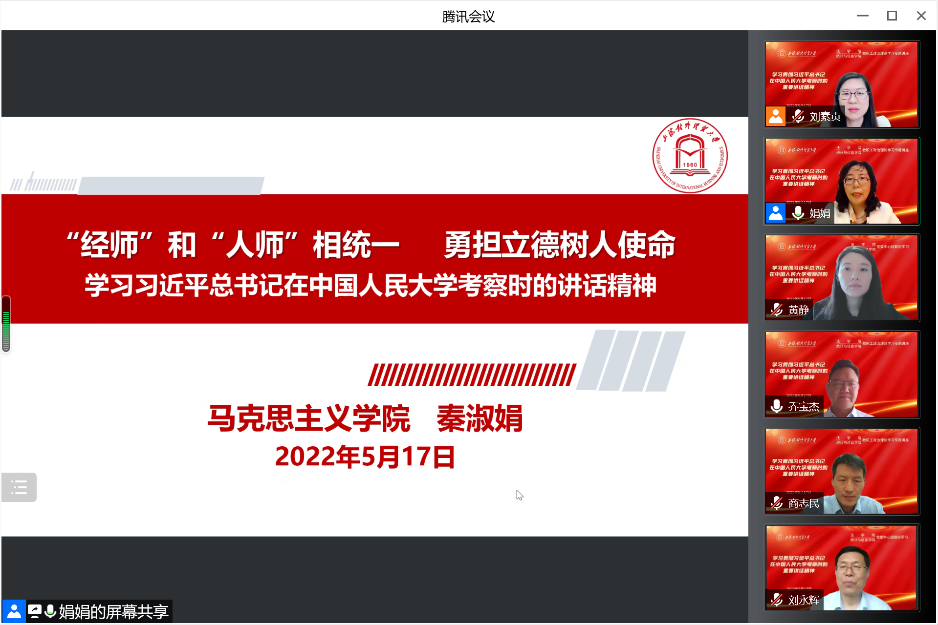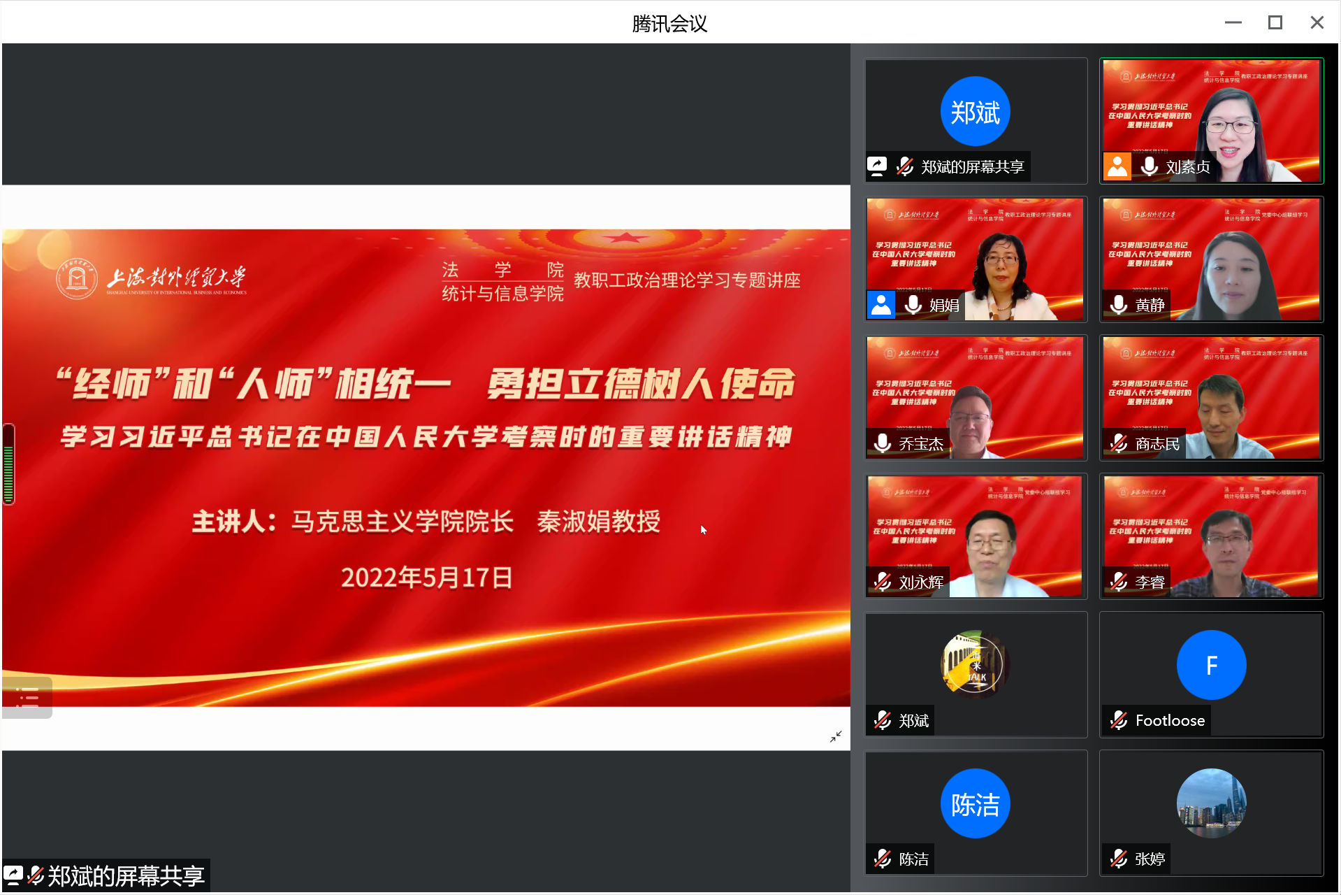 5月17日下午,法学院、统计与信息学院在线举行联组学习,专题学习习近平总书记在中国人民大学考察时的重要讲话精神,马克思主义学院院长秦淑娟教授受邀做专题辅导报告,法学院党委书记黄静、院长乔宝杰,统计与信息学院院长刘永辉、党委副书记(主持工作)刘素贞,以及两个学院领导班子成员、全体教职工共同参加学习。会议由刘素贞主持。