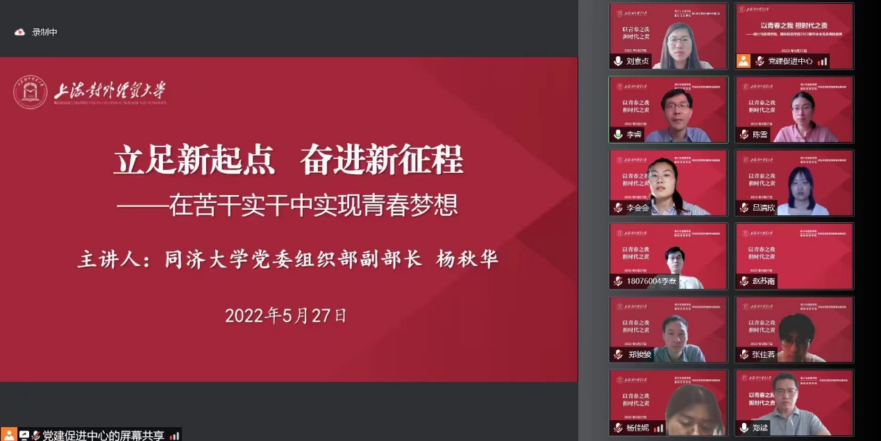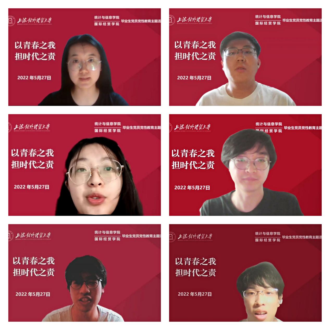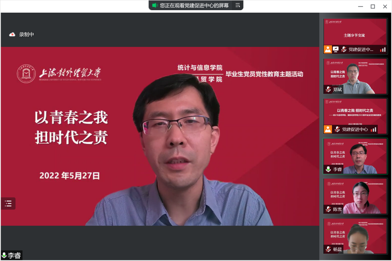 在2022届毕业生党员即将离开校园、步入社会之际,5月27日下午,统计与信息学院和国际经贸学院联合开展“以青春之我,担时代之责”2022届毕业生党员离校教育活动,通过专题党课、视频学习、入党宣誓、主题分享等形式,引导毕业生党员深入学习贯彻习近平总书记在中国人民大学考察时的重要讲话精神和在庆祝中国共产主义青年团成立100周年大会上的重要讲话精神,充分发挥党员先锋模范作用,不忘初心,砥砺前行。同济大学党委组织部副部长杨秋华,统计与信息学院党委副书记(主持工作)刘素贞,国际经贸学院党委副书记陈雪,统计与信息学院党委副书记李睿、党委组织员郑斌,统计与信息学院和国际经贸学院2022届毕业班辅导员、全体毕业生党员在线出席活动。活动由李睿主持。