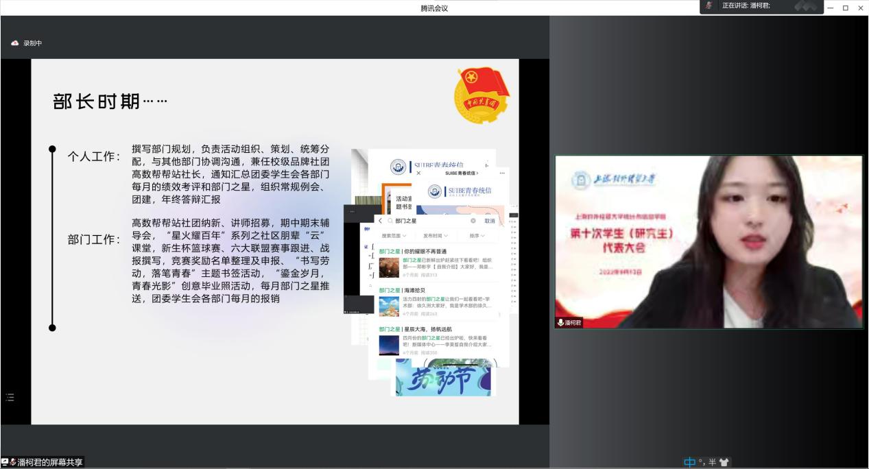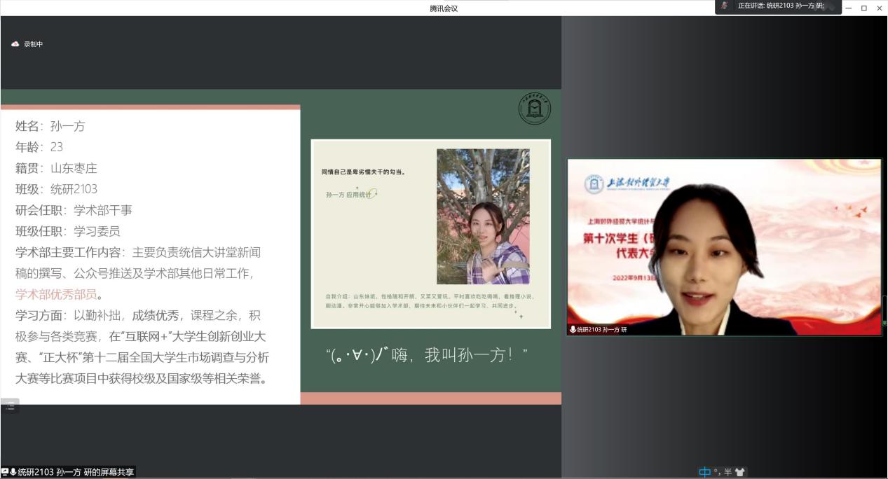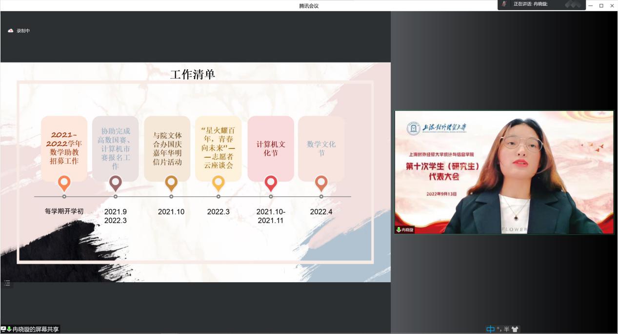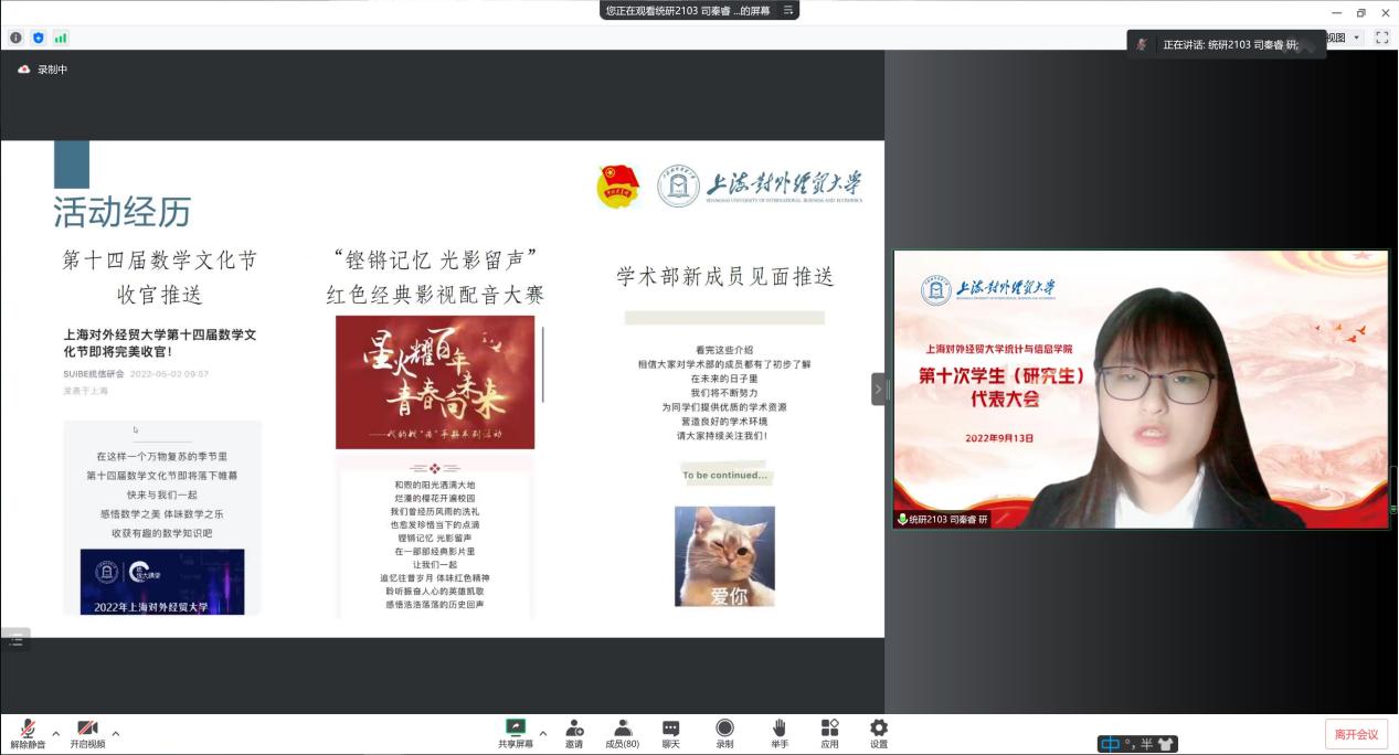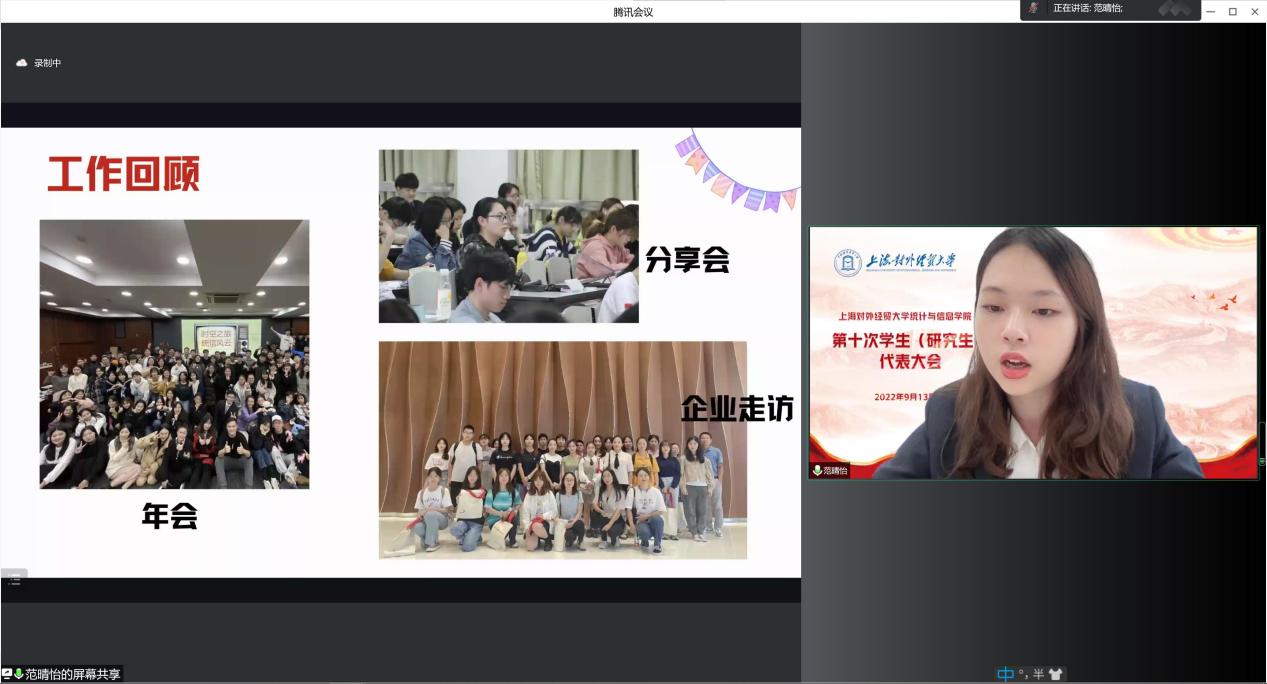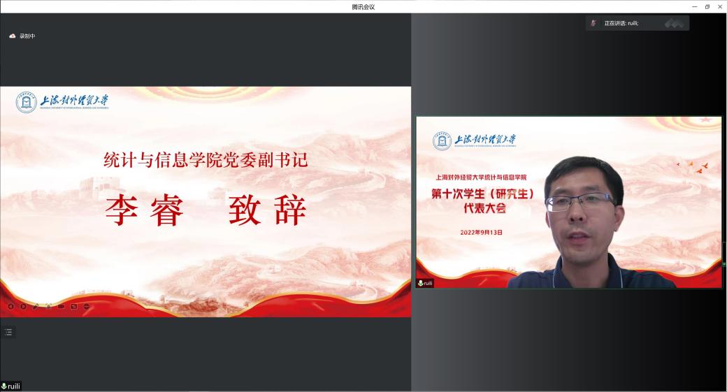 2022年9月13日,必赢626net入口首页统计与信息学院第十次学生(研究生)代表大会在线举行。必赢626net入口首页统计与信息学院党委副书记李睿,院团委书记肖包兴邦,学生党建主管冯越,团委副书记岳怡寒,上本科生党支部书记杨小帆,校学生会主席团成员丁隽仪同学,院学生会主席团成员沈怡佳同学、彭欣怡同学及65位学生、研究生代表出席了本次会议,会议由院团委副书记张君鸿同学主持。