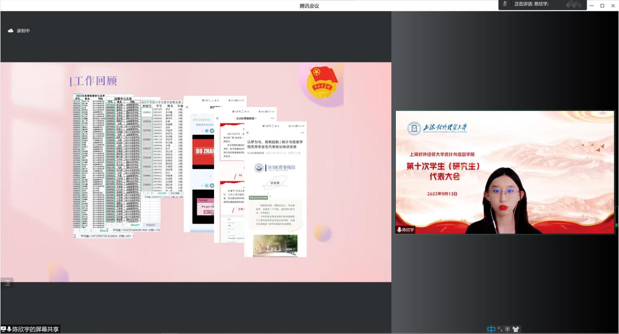 统计与信息学院第九届学生会主席团成员沈怡佳向大会作了题为《学生为本,服务为先,助力青年梦想;激扬青春,砥砺前行,筑梦统信华章》的工作报告,回顾了过去一年学生会在“引领青年思想、倾听青年需求、服务青年权益”的工作理念下所完成的各项工作。