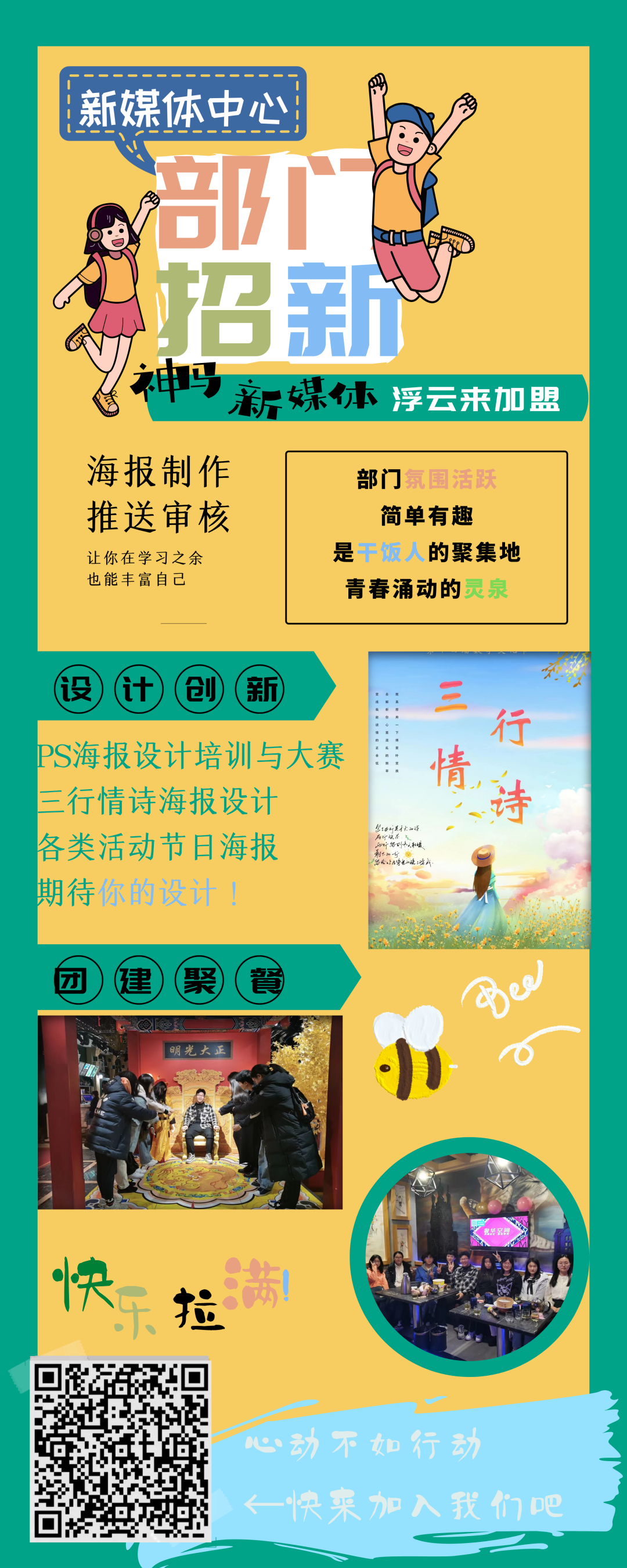 技术组主要负责宣传物料的设计与制作,衍生品素材的PS后期,以及院学生会的相关摄影工作。具体将分为海报与易拉宝的设计,宣传单的制作,短视频及宣传微电影的制作,军训及院活动的摄影工作。