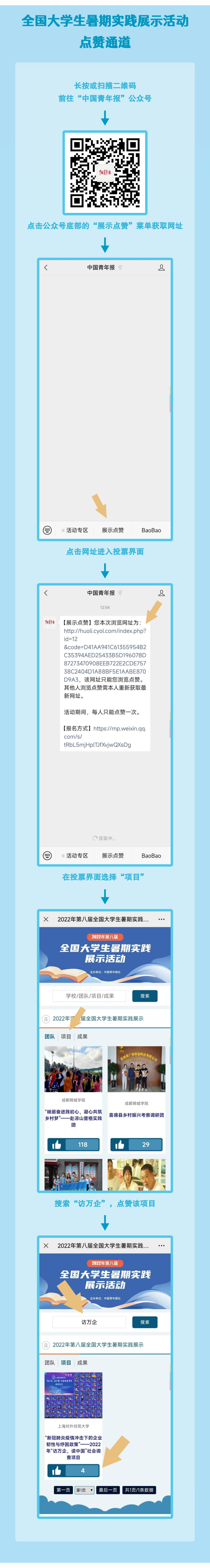 全国百强实践活动开始投票啦!关注公众号“中国青年报”,如下图流程操作,在投票页面选择项目,搜索“访万企,读中国”即可为我院“访万企,读中国”社会调查项目投票!请大家积极参与投票噢~感谢大家支持!