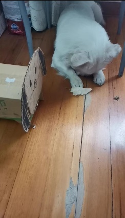看到球球不信任我,我只好向姐姐要来了一根纸香肠,递给球球。只见球球咬了几下,就皱着一张狗脸把纸吐了出来。