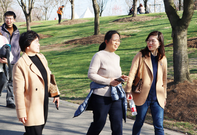 大家从公园1号门入园,满园春色扑面而来。树木葱郁,鲜花盛开;湖光潋滟,景色壮美。广场旁樱花道的河津樱已经绽放,老师们兴致盎然地观赏百花斗艳,合影留念。