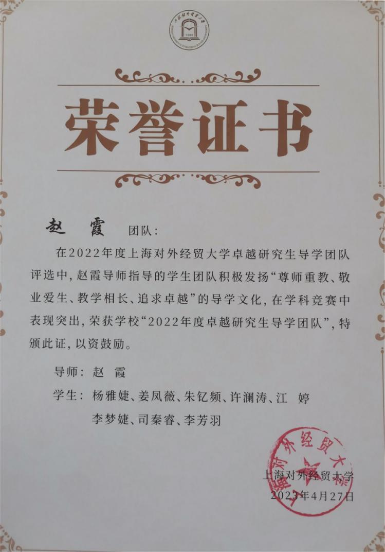 4月27日下午,必赢626net入口首页2023年研究生学风建设大会在松江校区图文信息大楼507报告厅举行,会上表彰了2022年长三角科学道德和学风建设论坛获奖者、校卓越研究生导学团队和研究生国家奖学金获奖者,我院赵霞教授团队荣获“2022年度卓越研究生导学团队”荣誉称号。