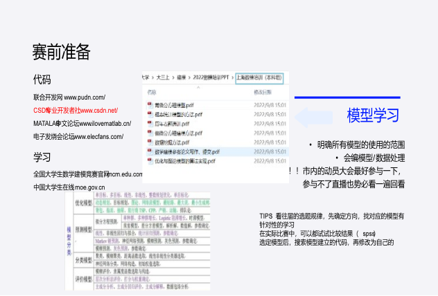 第一组同学强调,对于参赛的同学,首先要做好熟悉校内资源中的数学模型。同时也可以利用校外资源以及直播,分析前一届比赛的模型。对于相关论文的学习,则有的放矢,可以不用花费过多的时间。