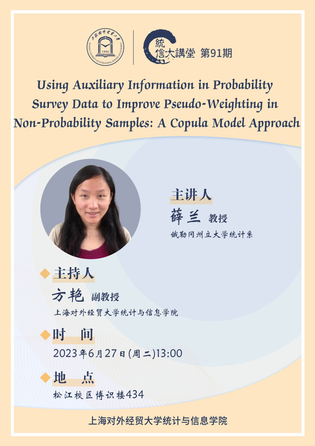 06.27 题目:Using Auxiliary Information in Probability Survey Data to Improve Pseudo-Weighting in Non-Probability Samples: A Copula Model Approach