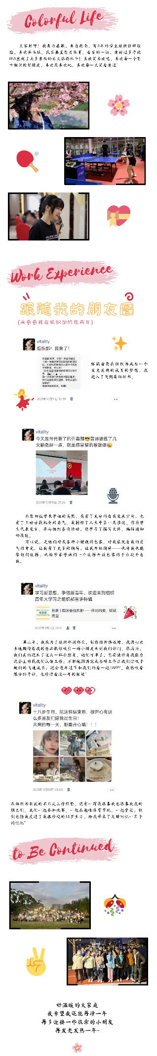 主要负责院团委组织部的活动宣传以及统筹各类团学活动;曾多次参与筹划校级品牌活动,以优秀的组织力与拼搏的进取心顺利完成各项任务;曾在院第十次学生(研究生)代表大会中担任主要学生干部,协助老师完成各类线上线下工作;在校乒乓球俱乐部工作的期间,曾组织俱乐部举行各类联赛活动,不断提高俱乐部成员凝聚力与向心力;曾获2021-2022学年第二学期优秀学生三等奖学金、2022-2023学年第一学期优秀学生三等奖学金、2022年全国大学生计算机能力大赛三等奖、2022年上海市大学生计算机应用能力大赛三等奖、2022年全国大学生数学建模竞赛上海市三等奖、2021-2022学年必赢626net入口首页校园体育先锋、2021-2022学年校计算机文化节vlog视频大赛二等奖、2021-2022学年校乒乓球女子单打冠军。