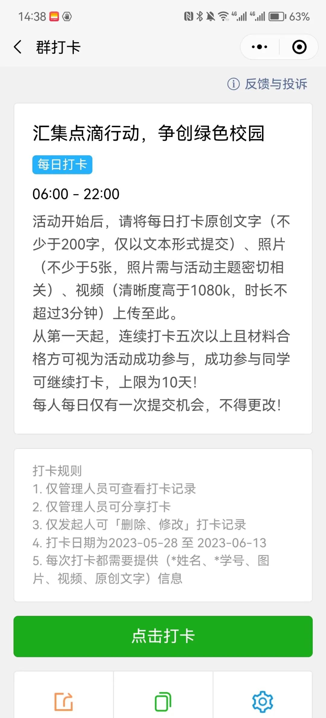 完成4次以上的低碳打卡活动且材料合格方可视为活动成功参与,成功参与同学可以继续进行打卡,上限时间为10天。