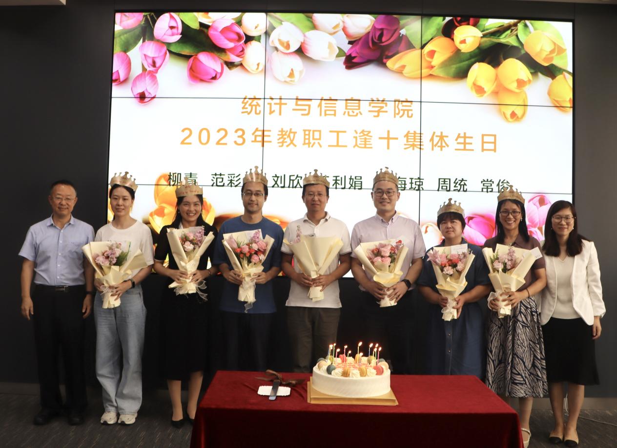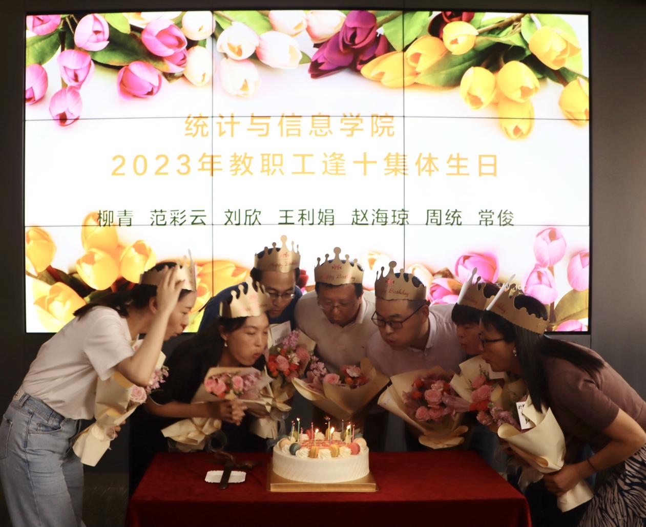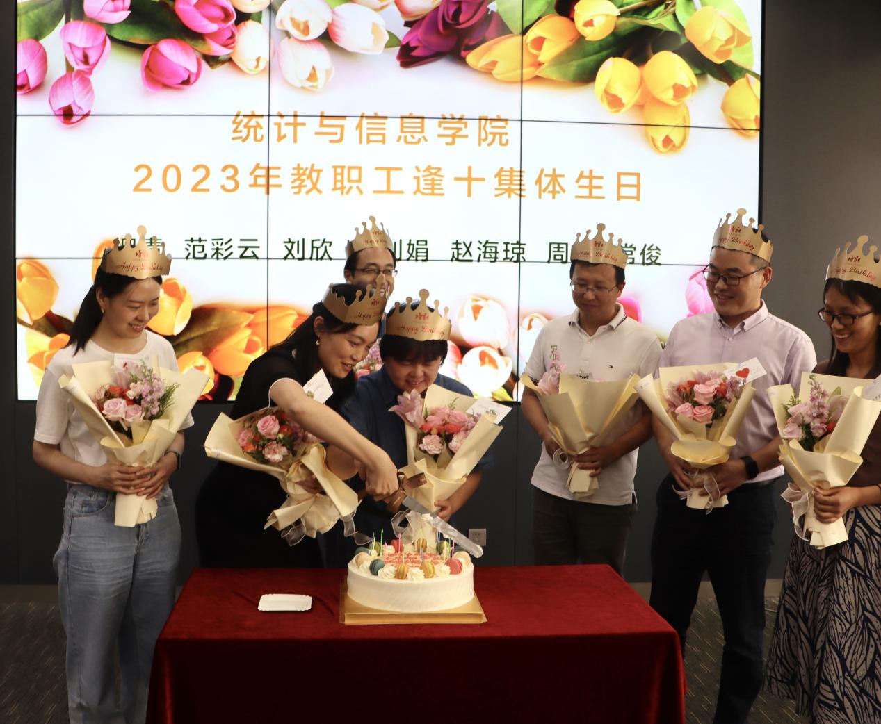 会上还特别策划举行了2023年教职工逢十集体生日会。学院工会副主席赵辉宣读了本年度逢十生日教职工名单:柳青、范彩云、刘欣、王利娟、赵海琼、周统、常俊。刘素贞和张日权代表学院工会为7位老师送上了鲜花和祝福。大家一起唱响生日快乐歌,老师们吹蜡烛,切蛋糕,其乐融融,充分感受到了统信大家庭的温暖,共同分享甜蜜与幸福。