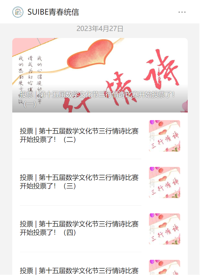 主要负责院学生会公众号“SUIBE青春统信”的运营与管理,协调学生会各部门推送的传播工作。主要包括各部门推送转发,国家法定节假日的通知,活动与重要通知的推送制作与转发公众号下方菜单栏的及时更新。