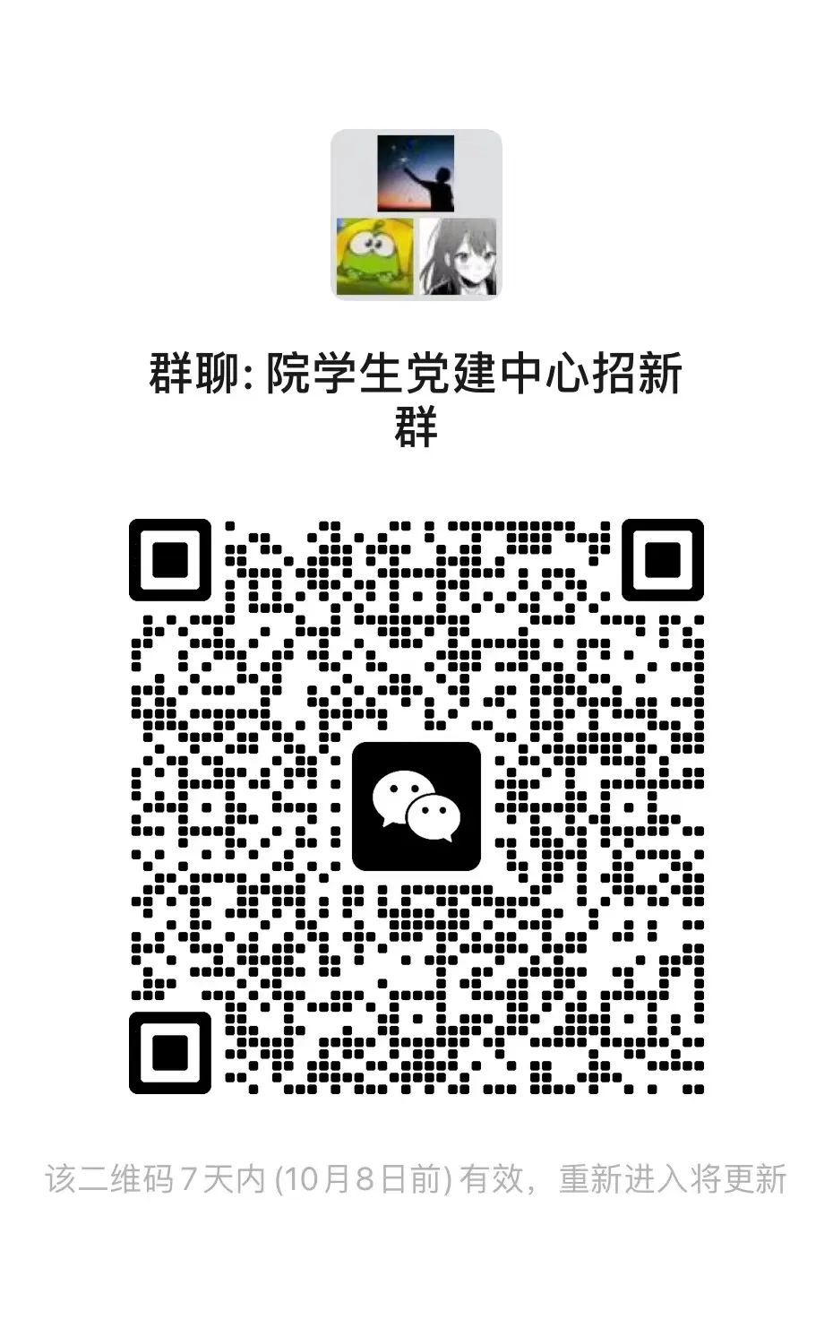 请有意向的同学填写《统计与信息学院学生党建中心报名表》(见附件),邮件主题以“统信学院学生党建中心申请-姓名”形式命名。报名表电子版于10月8日(周日)中午12:00前发送至邮箱txxydjzx2023@163.com,纸质版面试时提交(面试时间另行通知)。招新群二维码如下,统信学院学生党建中心期待你的加入!