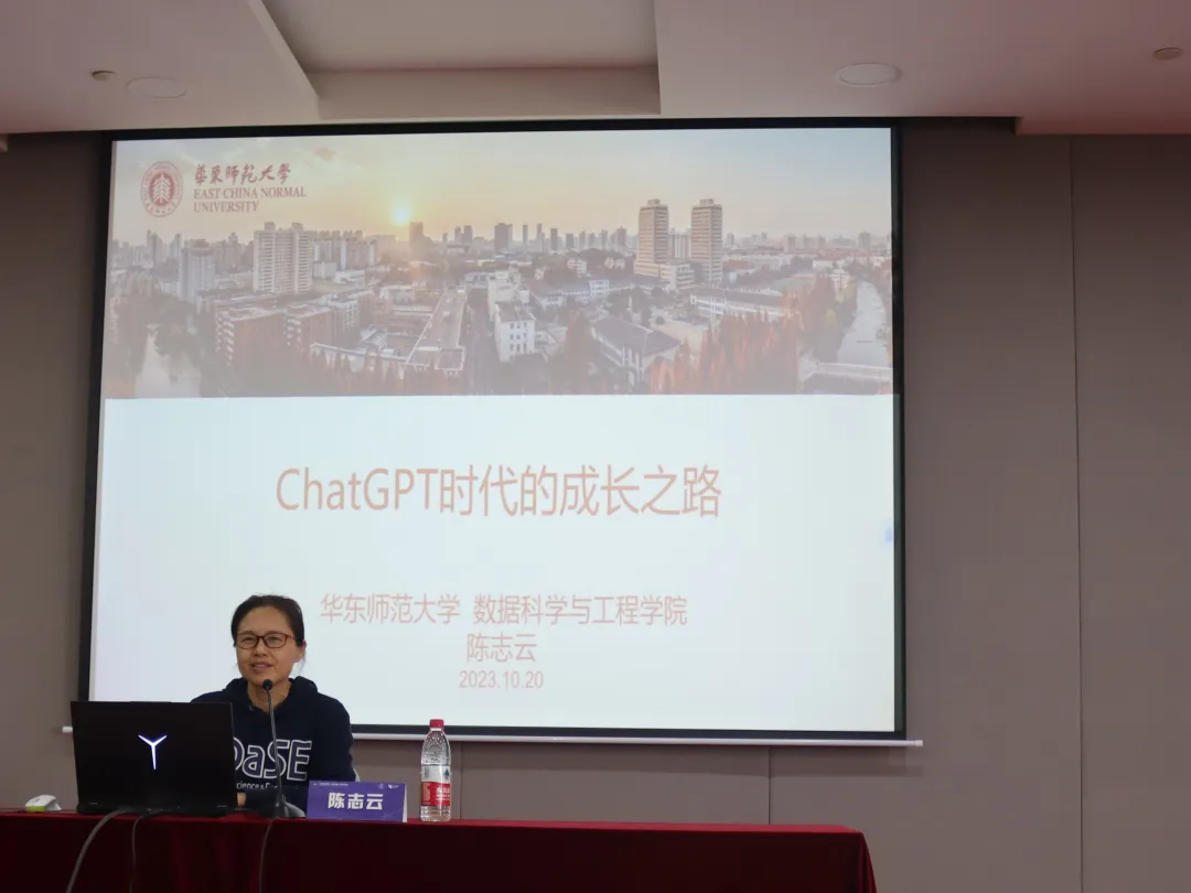 开幕式结束后,特邀嘉宾华东师范大学陈志云教授为大家带来讲座《ChatGPT时代的成长之路》,讲座详细阐述了深度神经网络技术在大模型和多模态两个方向上的应用与突破。陈教授指出,ChatGPT技术让人们进一步关注到AIGC在身边的蓬勃发展,并推动AIGC技术演化出智能数字内容孪生能力、智能数字内容编辑能力和智能数字内容创作能力三大前沿能力,技术的进步给学习与未来发展带来多种多样的机遇与挑战。讲座最后,现场学生与陈教授进行了互动交流。