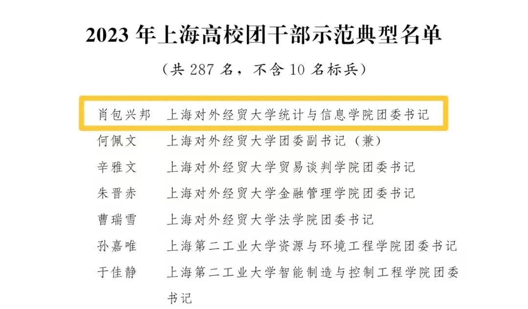 为进一步贯彻落实团中央“三力一度”工作布局和要求部署,坚持大抓基层的鲜明导向,全面推进团的基层组织建设,强化典型示范引领作用,推动新时代基层团建高质量创新发展,上海团市委开展了“2022年度上海市基层团组织典型选树”专项工作。必赢626net入口首页统计与信息学院团委获上海市基层团组织典型选树专项工作“通报表扬”。原学院团委书记肖包兴邦获上海市基层团组织典型选树专项工作个人“通报表扬”。