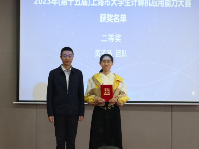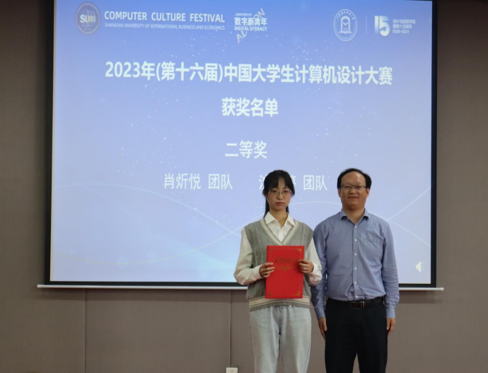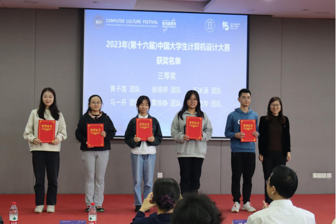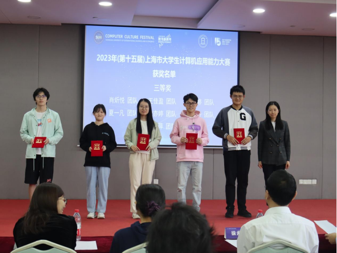 朱建明宣读了2023年中国大学生计算机设计大赛和2023年上海市大学生计算机应用能力大赛的获奖名单。