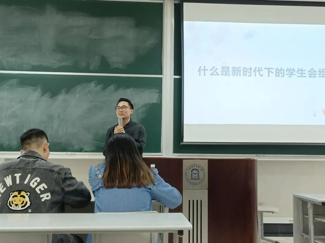 刘晓明老师首先从“什么是新时代下的学生会组织”这个问题引入,介绍学生会组织是党领导下的主要学生组织,是学校联系广大同学的桥梁和纽带,通过一系列生动案例引导学员牢记“全心全意服务同学”的宗旨。