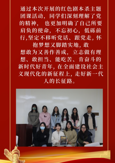 为深入学习贯彻习近平新时代中国特色社会主义思想,深刻领会党的二十大精神,认真做好面向广大团员和青年开展学习贯彻习近平新时代中国特色社会主义思想主题教育,着力加强对共青团员政治锻造,加强对广大青年政治引领,充分激发新时代中国青年在强国建设、民族复兴伟业中挺膺担当,统计与信息学院大一、大二全体团支部开展“学习思想强信念,挺膺担当建新功”主题团日活动。
