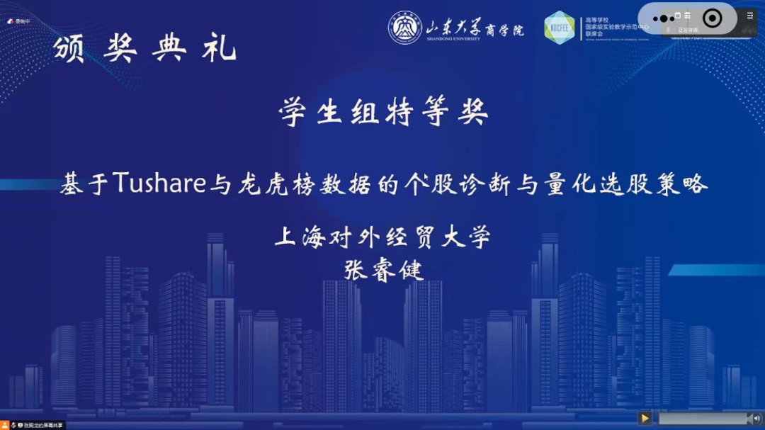 12月2日至12月3日,高等学校国家级实验教学示范中心联席会经管学科组在山东大学商学院(威海)举办2023第六届“智享杯”全国高校经管类实验教学案例大赛。人工智能专业22级张睿健同学的案例《基于Tushare与龙虎榜数据的个股诊断与量化选股策略》(指导老师:金融管理学院邓鸣茂老师),荣获大赛学生组特等奖。