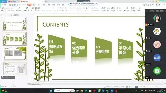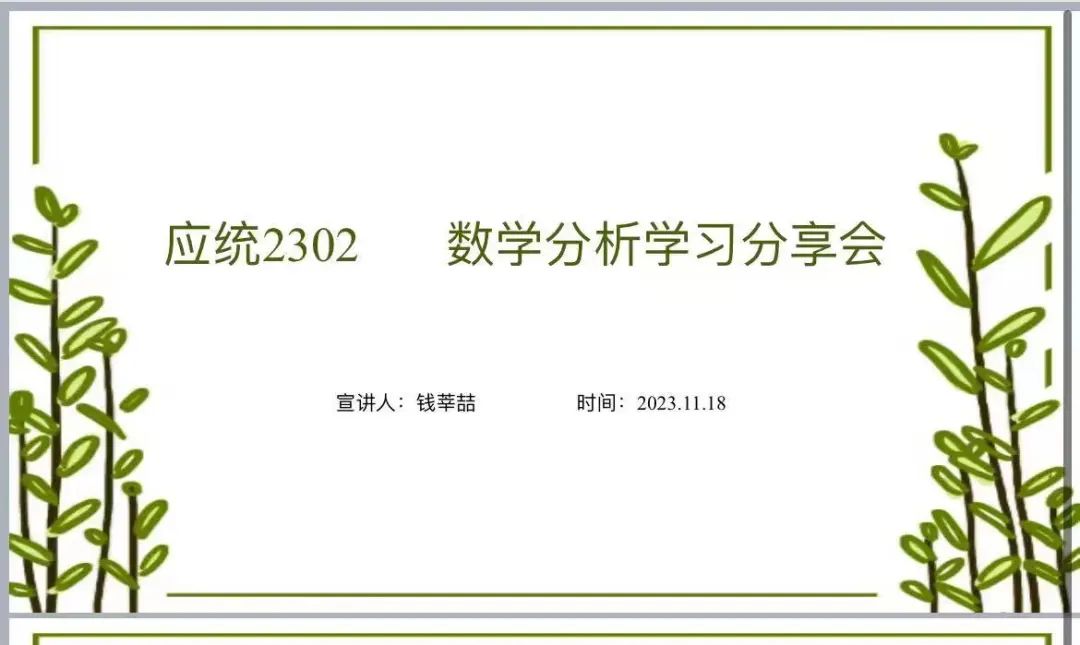 本次'学风+'数学分析学习分享会由班级学习委员为主讲,通过PPT的形式从四大方面'知识点汇总','优秀笔记分享','例题精讲','学习心得体会'进行了分享,以腾讯会议的形式与同学们进行了学习、交流。本次分享会提升了大家对学习数学分析的信心,掌握更好的学习方法,摸清学习数分的门路。