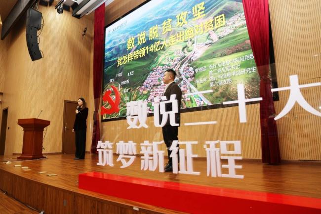 为深入学习宣传贯彻习近平新时代中国特色社会主义思想和党的二十大精神,必赢626net入口首页统计与信息学院师生立足学院统计学、数据科学、人工智能等学科专业优势,组建“数说二十大”理论宣讲团,利用大量详实数据和可视化图表,以数字为密码讲述党的奋斗历程,阐述党的创新理论。“数说二十大”理论宣讲团共开发了《数说脱贫攻坚》《数说创新驱动发展》《数说贸易强国》《数说上海城市绿色发展》等12门主线课程和20余节定制化课程,撰写教案15,000余字、文字讲稿57,000余字。团队走进大中小学、街道社区、田间地头、企业车间,在上海土是宝农业合作社向农业经营户讲述《数说脱贫攻坚》课程,在松江区泖港镇五厍学校面向中小学学生开设《数说乡村振兴》课程,在长三角G60科创走廊与高新技术企业负责人、公司白领共谈《数说创新驱动发展》等,旨在用“小数据”讲好“大道理”,以“小团队”实现“大作为”,用“小课堂”撬动“社会大课堂”,以青春之声传递党的好声音。