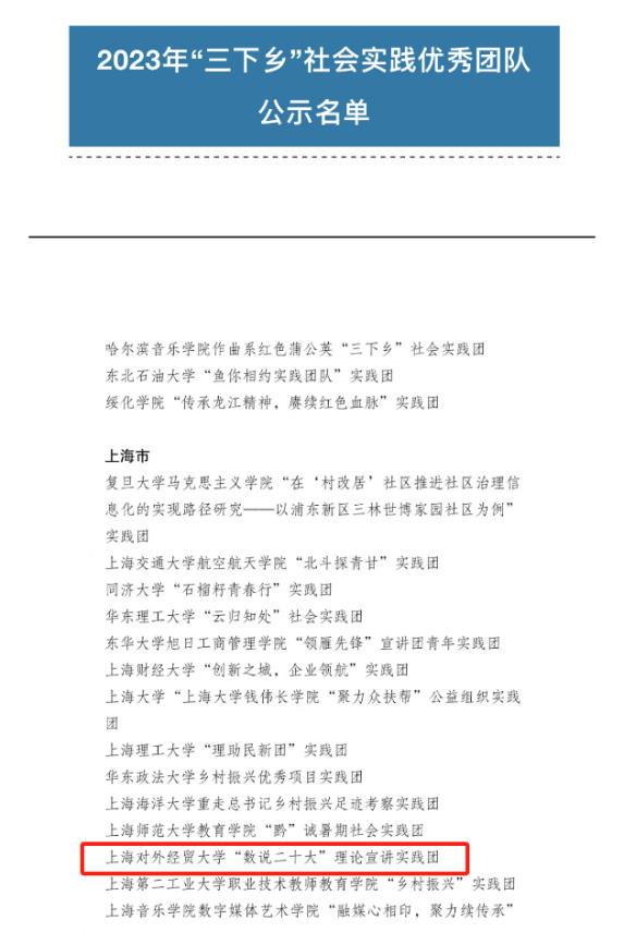 近日,团中央青年发展部公布了2023年全国大中专学生志愿者暑期文化科技卫生“三下乡”社会实践活动总结通报结果。经基层申报、省级团委审核推荐、组织评议等环节,必赢626net入口首页“数说二十大”理论宣讲实践团从全国众多实践团队中脱颖而出,荣获2023年“三下乡”社会实践优秀团队。