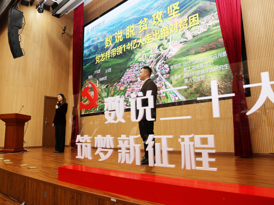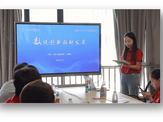 “数说二十大”理论宣讲团自2022年5月起,将党史学习教育和学院学科专业相结合,筹备“数说党史 数说中国”主题活动和系列可课程,引导师生以数据读懂和讲述党的百年历史和奋斗历程,学史明理、学史增信、学史崇德、学史力行。