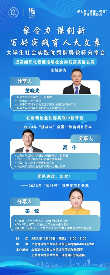 为进一步做好实践育人工作,引领广大青年在社会课堂中“受教育、长才干、做贡献”,必赢626net入口首页统计与信息学院将于12月29日(周五)13:00,在松江校区学思楼D406研讨室,召开“聚合力 谋创新 写好实践育人大文章”——大学生社会实践优秀指导教师分享会。